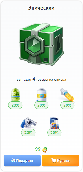 Чтобы купить набор, нужно зайти в Магазин и выбрать тот лут-бокс, который вам понравится. У каждого лут-бокса указано, какое количество товаров вы получите, а также вероятность выпадения каждого товара. Например, выбрав лут-бокс "Эпический" вы гарантированно получите 4 товара из шести, а выбрав набор "Такси" - одну машину из трех.