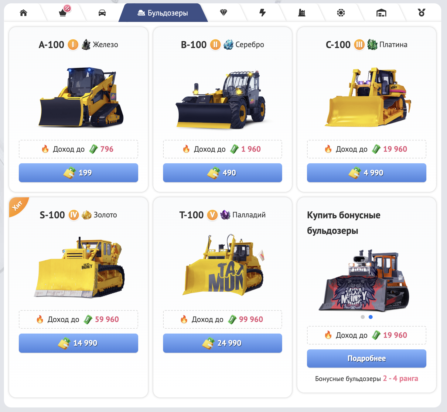 Добывайте руду на нетрудоустроенных бульдозерах, чтобы доход с продажи этой руды пополнял Ваш счёт вывода.