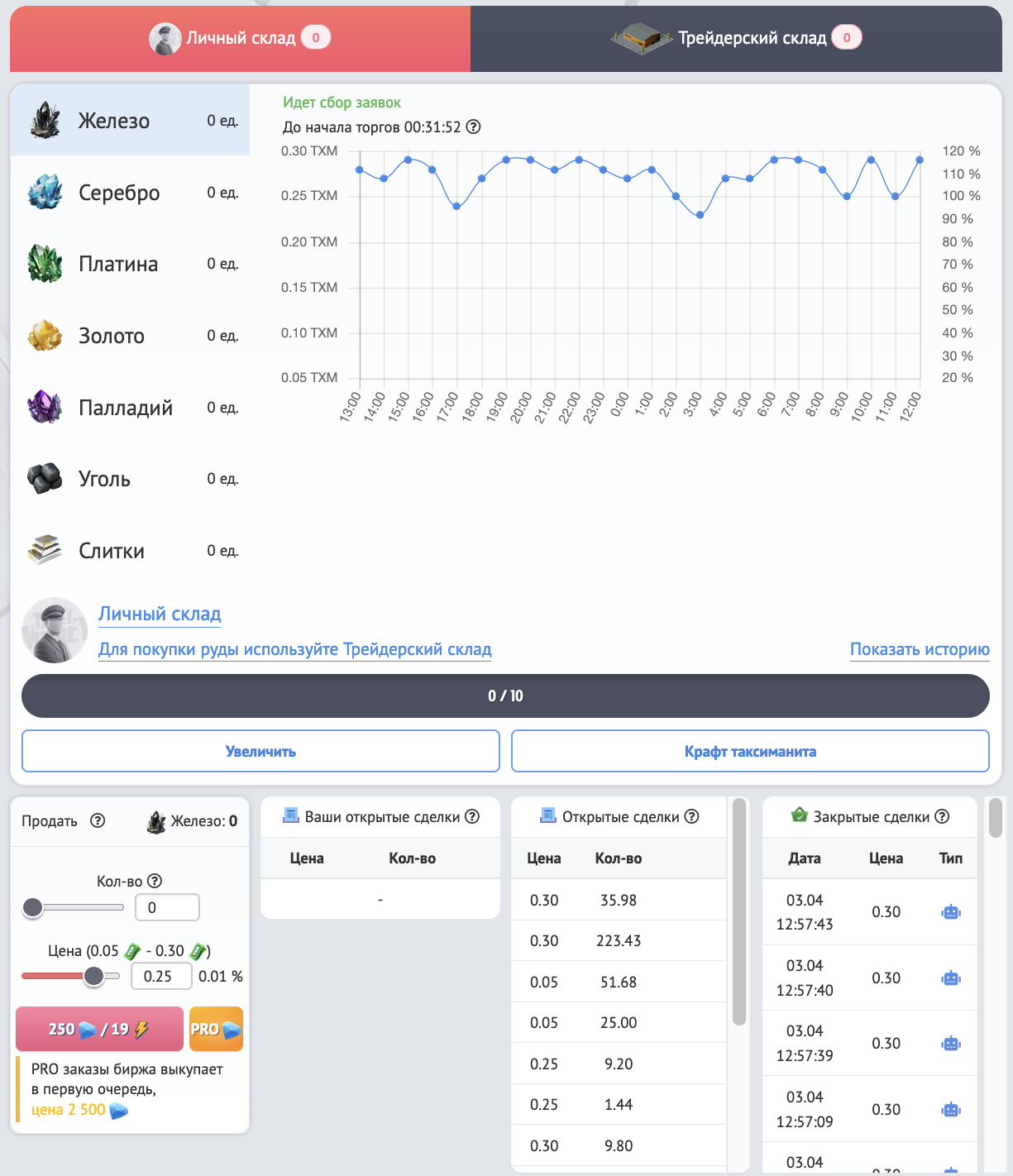В блоке “Ваши открытые сделки” отображается руда, которую Вы выставили на продажу, тут можно отменить заказ. Если произошел частичный выкуп ресурса и ордер был Вами отменен, то кристаллы за размещение ордера не возвращаются.