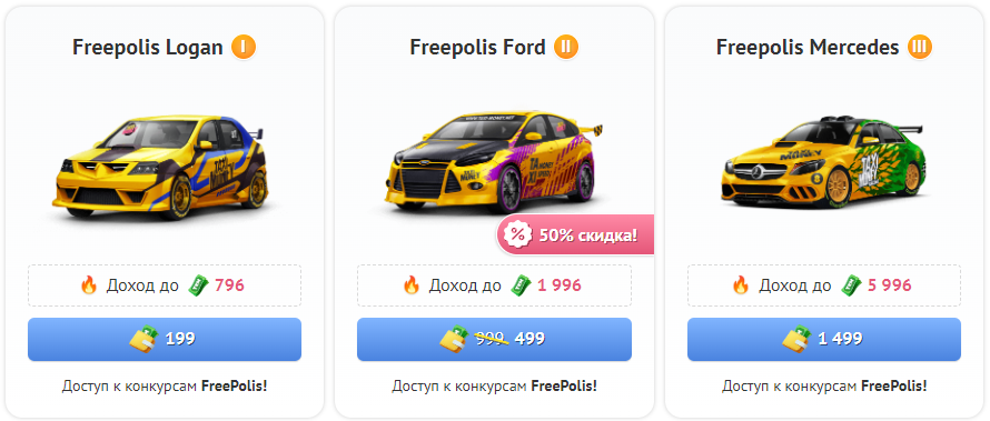 FreePolis — новые конкурсы с денежными вознаграждениями в Taxi-Money. В этом конкурсе могут участвовать только машины FreePolis Logan (1 уровень), FreePolis Ford (2 уровень) и FreePolis Mercedes (3 уровень).