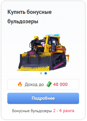 Другие можно получить только во время проведения акции. Для этого необходимо пополнить счёт покупок в соответствии с сеткой акции. Вы получите бульдозер в подарок, внесённые средства зачислятся на Ваш счёт покупок, а бонусный счёт будет пополнен кэшбэком в установленном размере. Следите за новостями, чтобы не пропустить такую акцию.