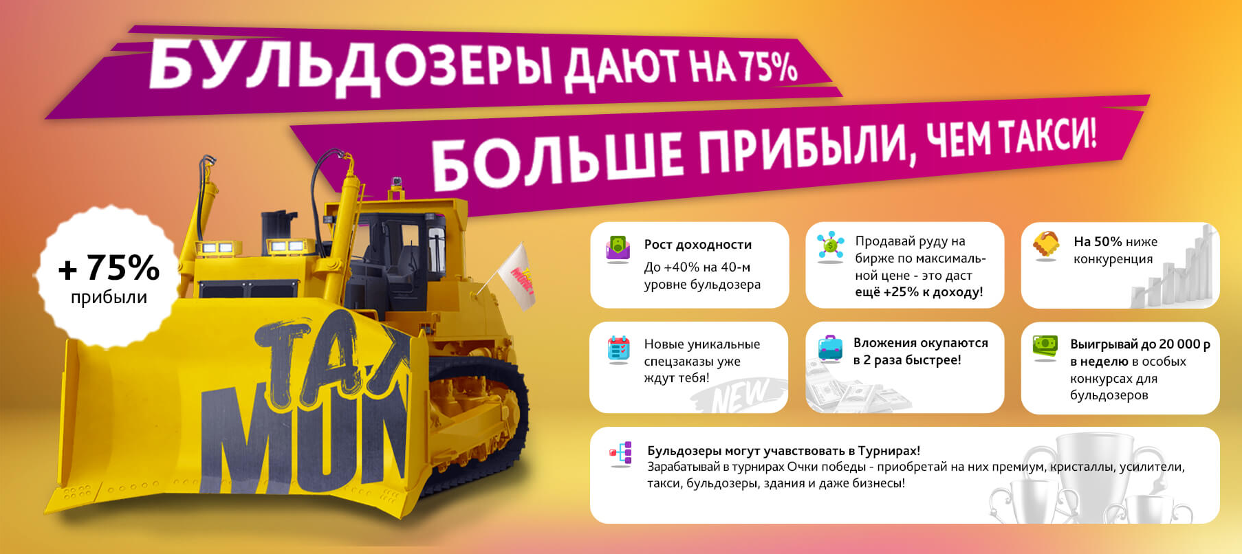 Бульдозер позволит Вам добывать руду, и станет отличным источником заработка в Taxi-Money! Приобретайте бульдозеры, ищите руду на интерактивных картах, добывайте её и продавайте руду на бирже.