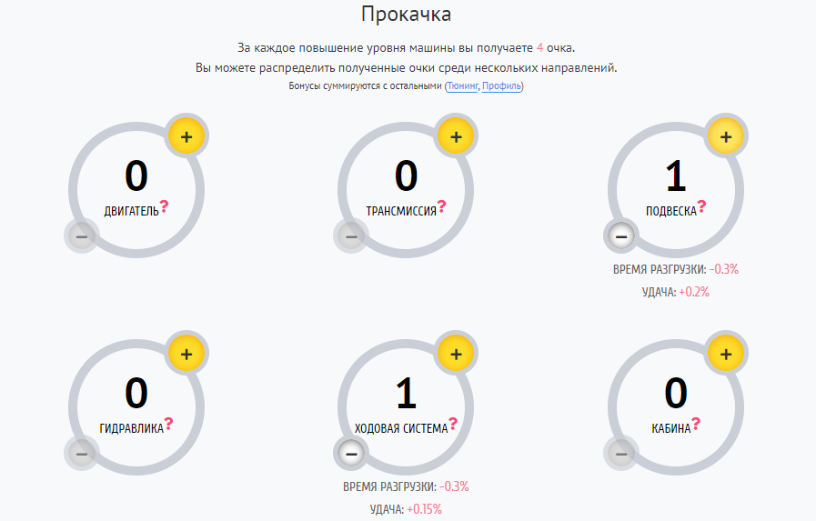 Чтобы распределить очки опыта и получать от этого пассивные бонусы выберите бульдозер в Вашем гараже, откройте его страницу и переключитесь на вкладку «Прокачка». Далее нажимайте на кнопки «+» или «-», чтобы увеличить или уменьшить количество очков прокачки на интересующих Вас характеристиках: