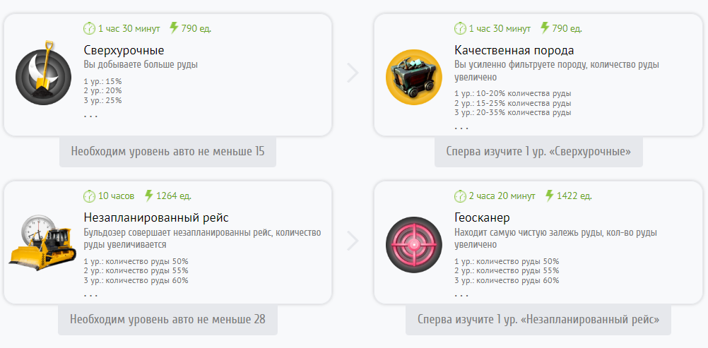 Способности бульдозеров позволяют сокращать время добычи и разгрузки, а также увеличить количество добываемой руды. Изучайте способности на каждом из Ваших бульдозеров, чтобы добиться максимальных результатов в игре!