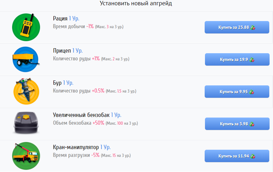 В игре есть множество способов улучшения Ваших результатов добычи руды — использование способностей, тюнинг, прокачка бульдозеров, а также использование товаров-усилителей из магазина.