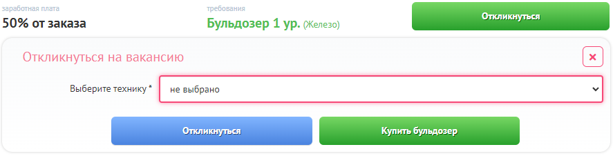 Затем выберите, какой бульдозер Вы хотите устроить в данную компанию, при помощи выпадающего списка.