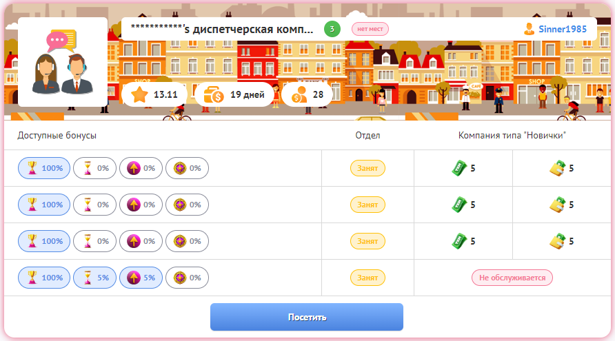 Выберите наиболее подходящую Вам Диспетчерскую компанию, исходя из рейтинга, доступных бонусов, занятости отделов и стоимости услуг компании, и нажмите на кнопку «Посетить».