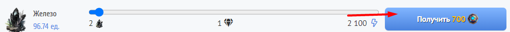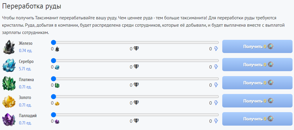 Для переработки необходимо выбрать количество руды и нажать на кнопку "Получить"