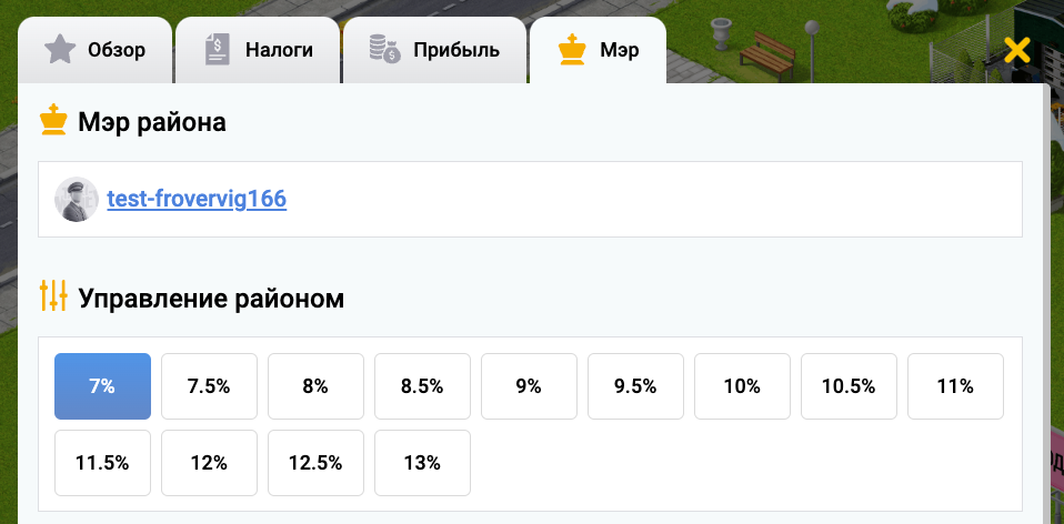 Если Вы владелец налоговой, то становитесь мэром района, в котором эта налоговая построена и регулируйте доход со всех операций в этом районе. Будь то доход от выполненных заказов, покупку участков и возведение зданий или выполненные услуги в бизнесах.