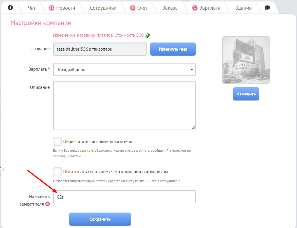 Назначить на должность и снять с должности заместителя может только владелец компании. Заместитель назначается из числа сотрудников компании. Заместитель не может выводить средства со счетов компании. Заместитель не может расходовать собственные средства на строительство “Построек для бизнеса”. Назначать заместителя можно только владельцам, у которых есть Premium аккаунт.