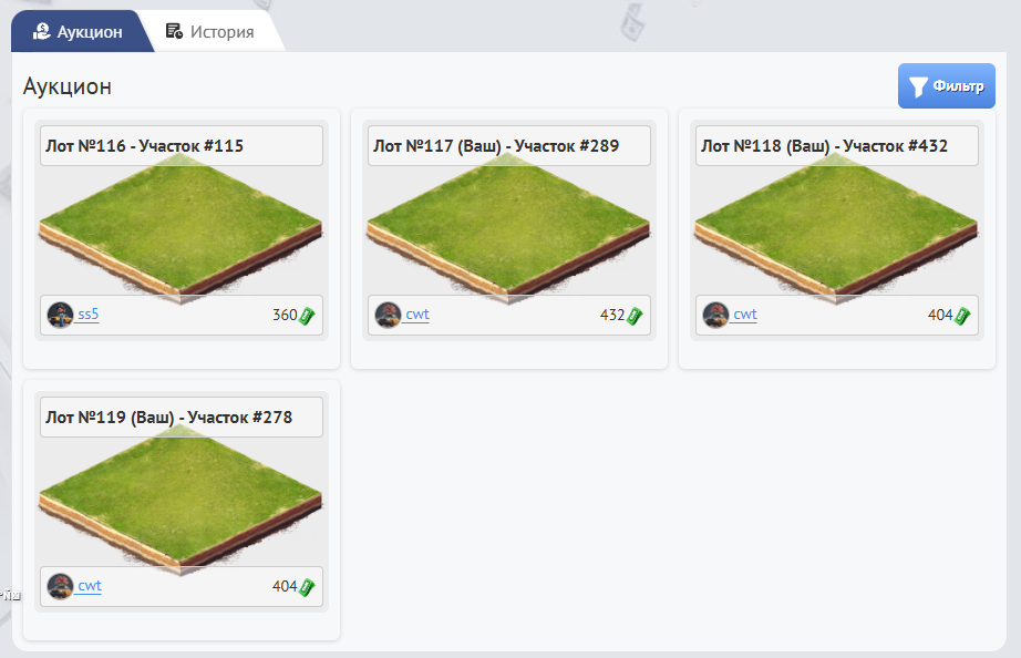 По итогу, Вы окажитесь на главной страницы аукциона, где будут представлены все доступные лоты(участки) для покупки