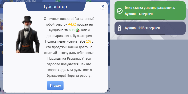 После того, как Вы успешно завершили Раскатку участка перед этим выбрав путь его продажи на аукционе и сделав все настройки: