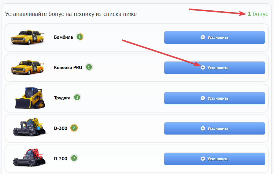 После чего Вам откроется меню, в котором Вы будете распределять бонусы на свою технику