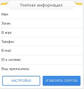 Имя пользователя, логин, количество дней в игре, телефон, электронная почта, ID в системе, пригласитель.