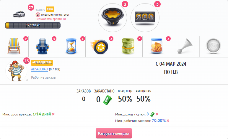 По контракту доступна информация о результатах работы, количестве заказов, доходе, статистике по дням.