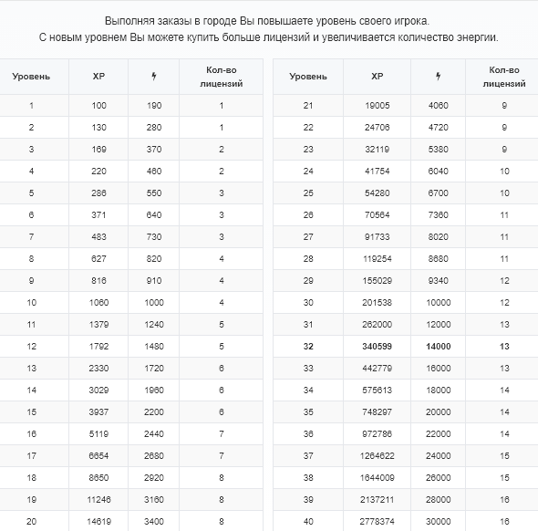 Всего 40 уровней игрока. С новым уровнем Вы можете купить больше лицензий и увеличивается количество энергии.