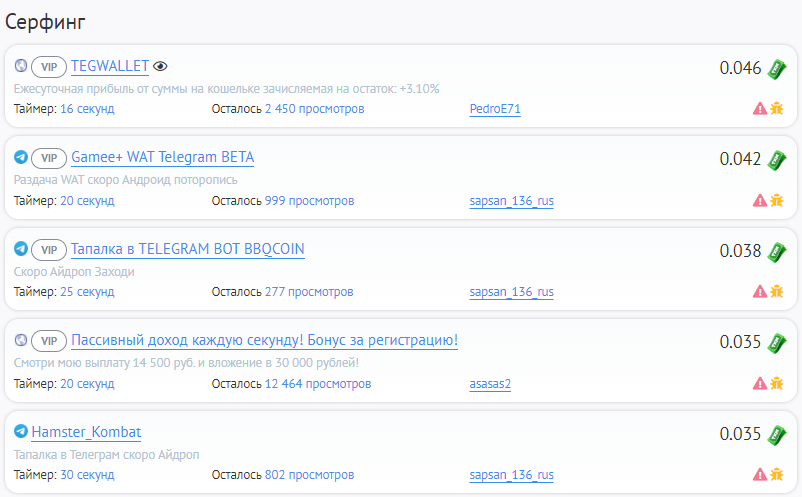 • 3 вида заработка: просмотр сайтов, выполнение заданий, чтение писем (в разработке).