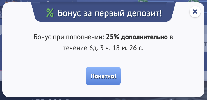 Бонус на первое пополнение составляет 25% и действителен в течении недели после регистрации.