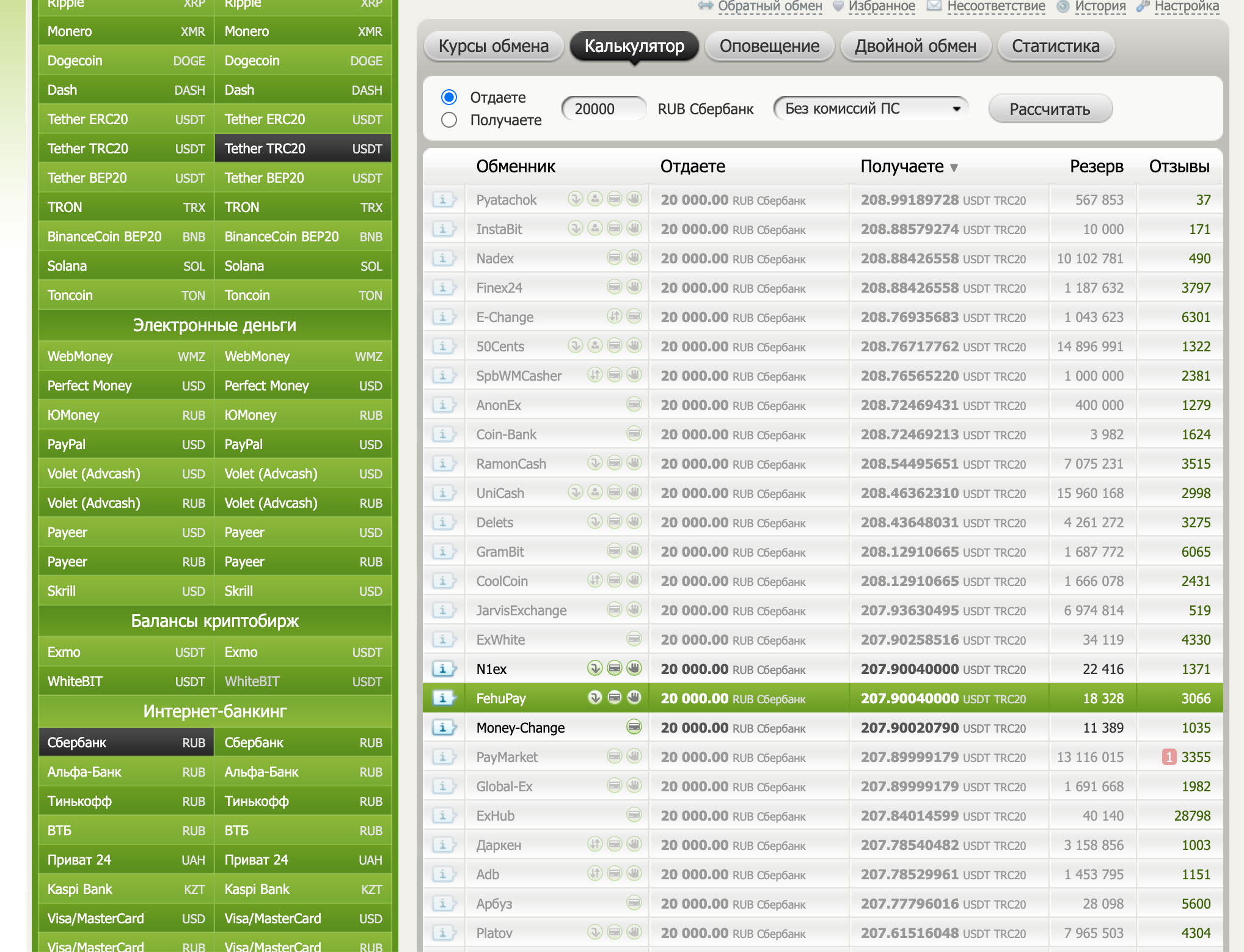 Выберите в таблице слева направление обмена. Например: «Отдаёте» — «Сбербанк», «Получаете» — «Tether TRC20». Далее нажмите на кнопку «Калькулятор», задайте сумму обмена и нажмите на кнопку «Рассчитать». Результаты будут отсортированы от более выгодных для Вас к менее выгодным.