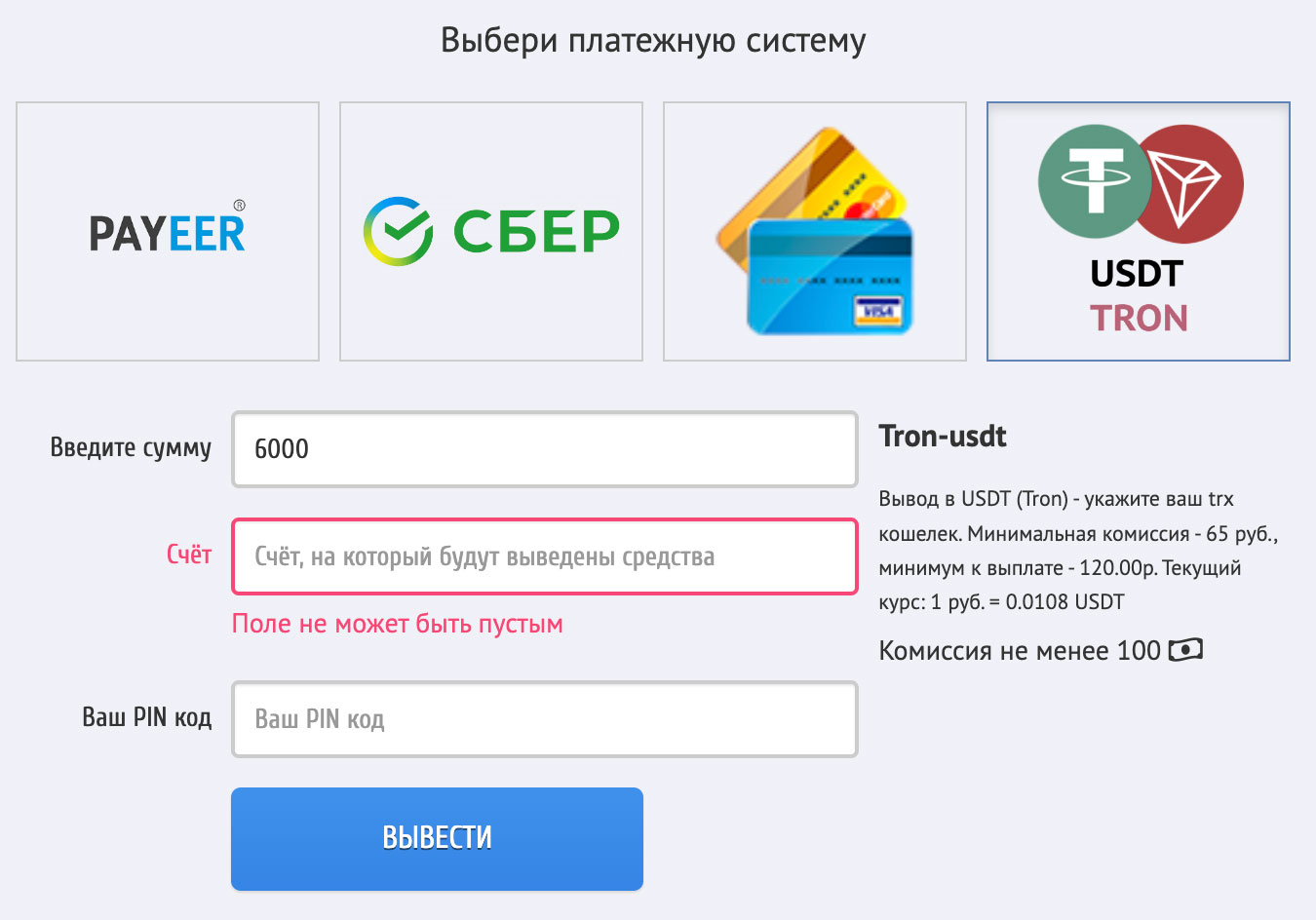 2. Зайдите в игре в раздел «Вывести». Выберите платёжную систему USDT Tron. Введите требуемую сумму к выводу, ранее скопированный адрес Вашего кошелька USDT Tether (в поле «Счёт») и (при необходимости) Ваш PIN-код.