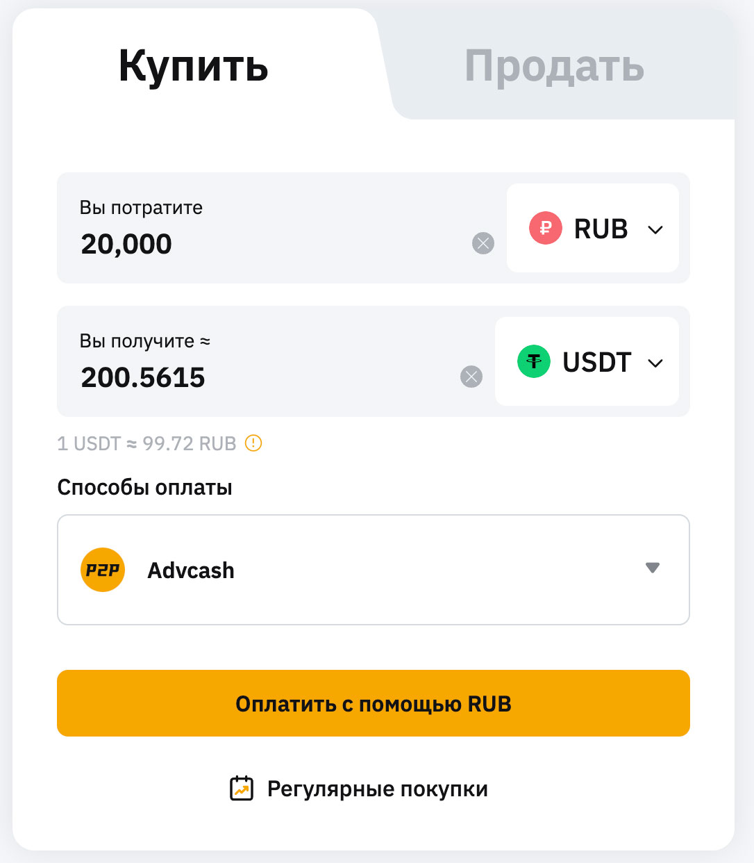 Введите требуемую Вам сумму (не забывайте о комиссиях за транзакции) в рублях и выберите подходящий Вам способ оплаты. Если никакой из представленных способов оплаты не отзывается у Вас в сердце — оставьте предложенный по умолчанию способ P2P-оплаты.