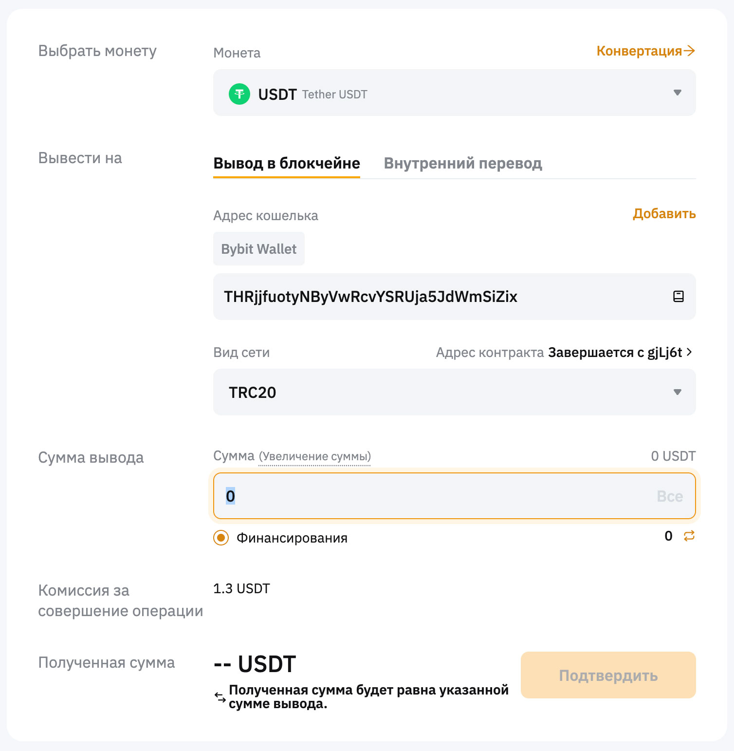 Перейдите на страницу «Вывод» («Withdrawal») на Bybit. Выберите соответствующую монету (в данном примере — USDT Tether). Скопируйте в форму вывода кошелёк и точную сумму с предыдущего экрана. В данном примере сетью для USDT Tether является TRC 20.