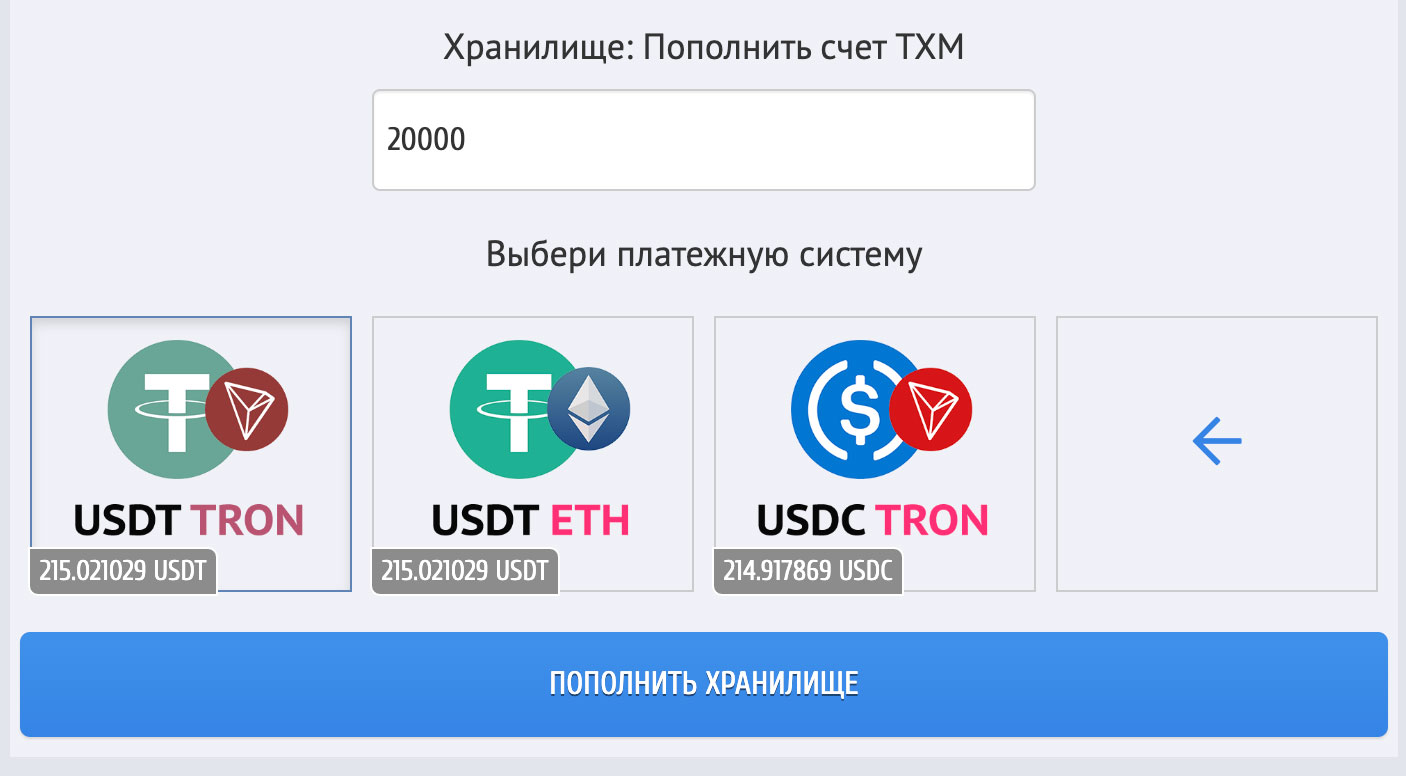 1. Перейдите в раздел «Пополнить» / «Хранилище» на сайте игры. Выберите в форме интересующую Вас криптовалюту (например, USDT / USDT TRON). Введите сумму пополнения в TXM (в рублях). И нажмите на кнопку «Пополнить Хранилище».
