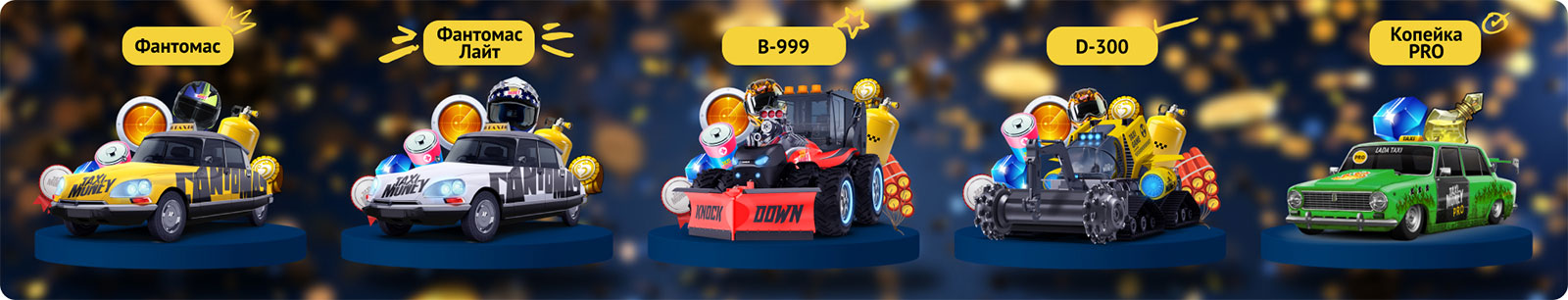 Помимо такси Фантомас, Фантомас Лайт и бульдозера B-999 игра подарит тебе такси Копейка, бульдозеры A-100, B-100 или C-100 + кэшбек в подарок за депозиты на соответствующие суммы.
