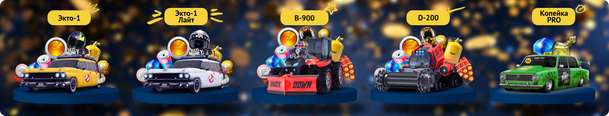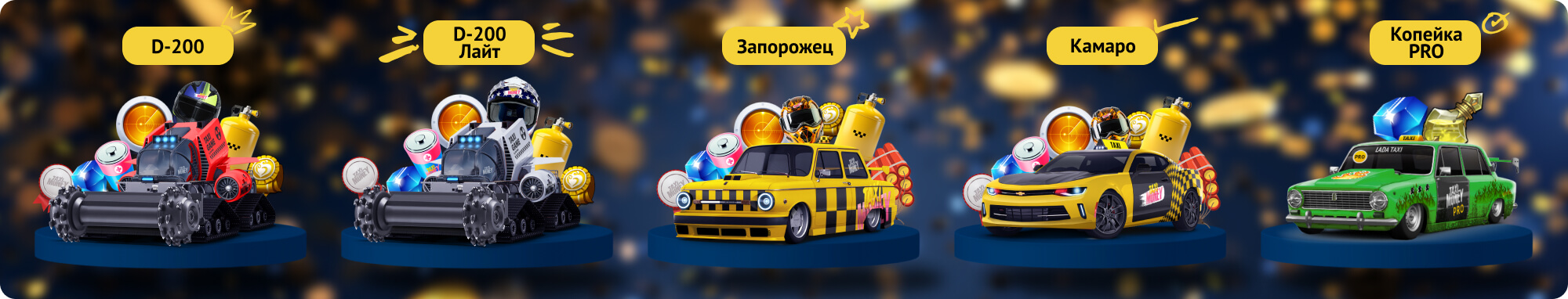 Выиграй топовое такси или бульдозер для заработка всего от 49! В сентябре 2024 в лотереях с монетами участвуют бульдозеры D-200, D-200 Лайт, а также такси Копейка PRO, Запорожец и Камаро!